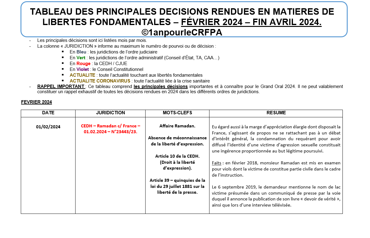 Le Tableau regroupe plus de 50 décisions et actualités entre Février 2024 et Fin Avril 2024 et notamment : – CEDH, Ramadan c/ France – 01/02/2024 (Droit à la liberté d’expression) – Conseil d’Etat – 02/02/2024 – Position de la CNIL et conservation de la trace des baptêmes – CEDH, Auray et autres c/ France – 08/02/2024 (encerclement de manifestants par les forces de l’ordre) – Loi sur le droit des enfants au respect de leur image – CEDH « Wa Baile c/ Suisse » (contrôle au facièes et profilage racial) – CEDH « Danilet c/Roumanie » (Liberté d’expression des magistrats sur Facebook) – Loi constitutionnelle relative à la liberté de recourir à l’interruption volontaire de grossesse – CEDH « Tamazount et autres c/ France » (condamnation pour indemnisation insuffisante des Harkis et de leurs familles) – CEDH et inaction climatique – Projet de loi relatif à l’accompagnement des malades et de la fin de vie – […] PROMO HIVER 2024 (Prix initial : 6,5€)