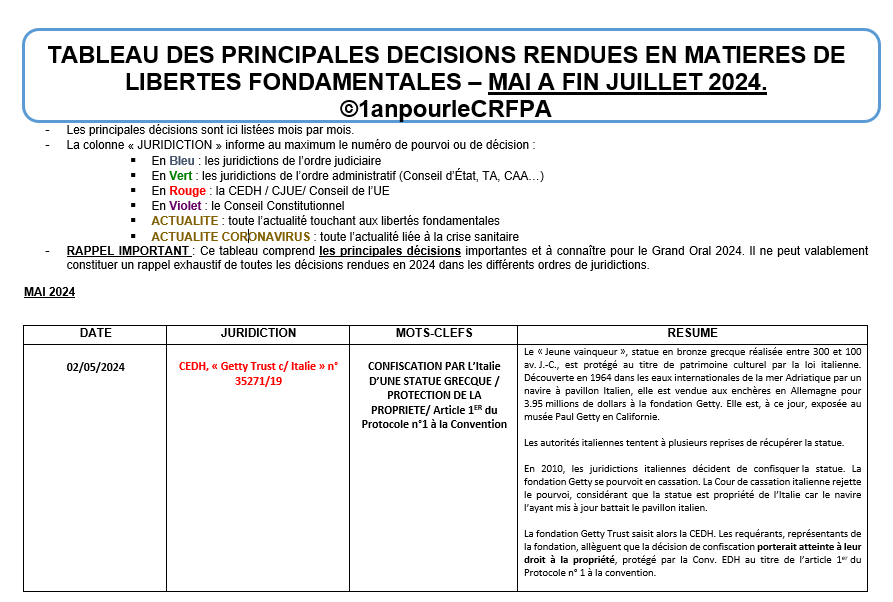 1anpourleCRFPA facilite les révisions par la collecte de l’actualité en matière de #DLF avec un fichier PDF sous forme de Tableau Chronologique. Pour chaque décision et actualités, la date précise de sortie, les mots clefs associés et un résumé exhaustif de la décision ou de l’actualité en question.