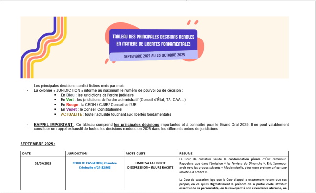 Le Tableau mis en ligne ce Mardi 21 Octobre 2025 regroupe près de 40 décisions et actualités, moments forts de l’actualité en France et à l’international entre Septembre 2025 et le 20 Octobre 2025. Le fichier fait 24 pages.