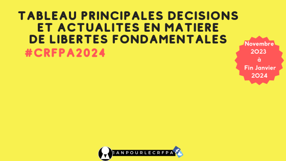 Les Tableaux des Principales Décisions et Actualités reviennent pour le #CRFPA2024. Tous les 3 mois, jusqu’à l’épreuve du Grand Oral, un nouveau Tableau pour un suivi et une vision globale de l’ensemble de l’actualité en matière de Libertés Fondamentales. 1anpourleCRFPA vous facilite la collecte de l’actualité avec un fichier PDF sous forme de Tableau chronologique. … Continuer la lecture de Tableau Principales Décisions et Actualités – Novembre 2023 à Fin Janvier 2024